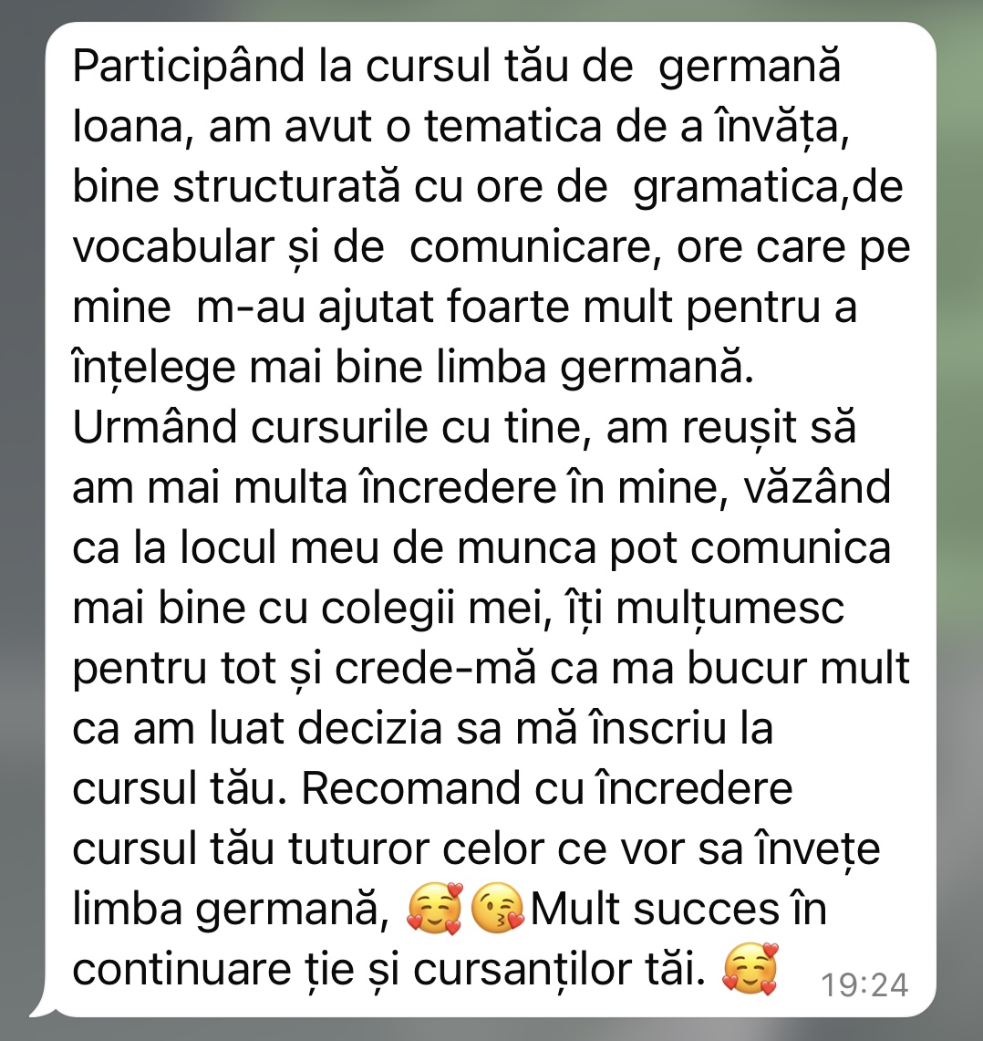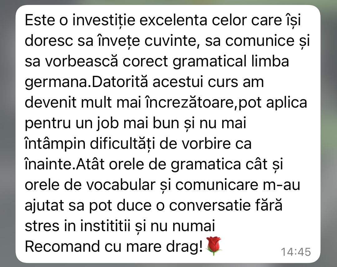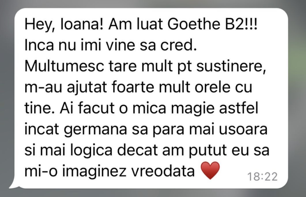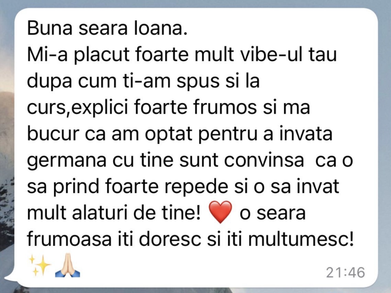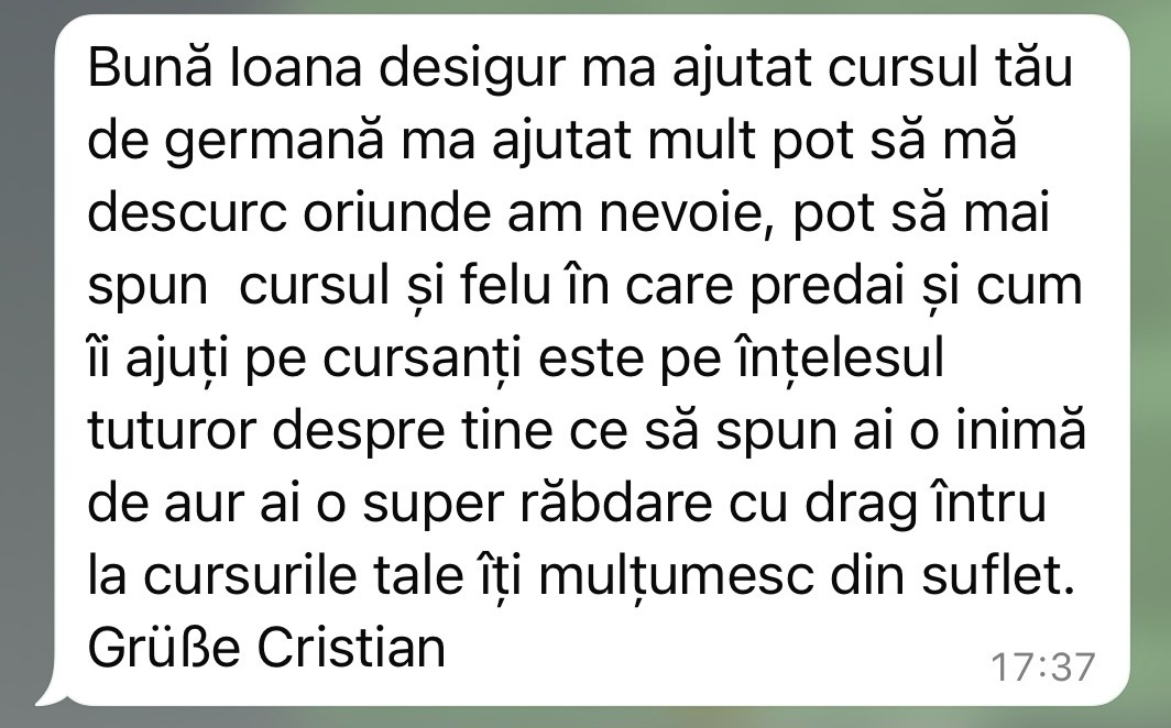 Având în vedere experiența acumulată în cei peste 5 ani de predare a limbii germane în format online, pot spune cu încredere că acei cursanți care și-au păstrat motivația și perseverența de a urma firul roșu trasat de mine au reușit să își atingă obiectivele. În doar 6 luni, au ajuns la nivelul B1 și au obținut certificatul de limbă germană.