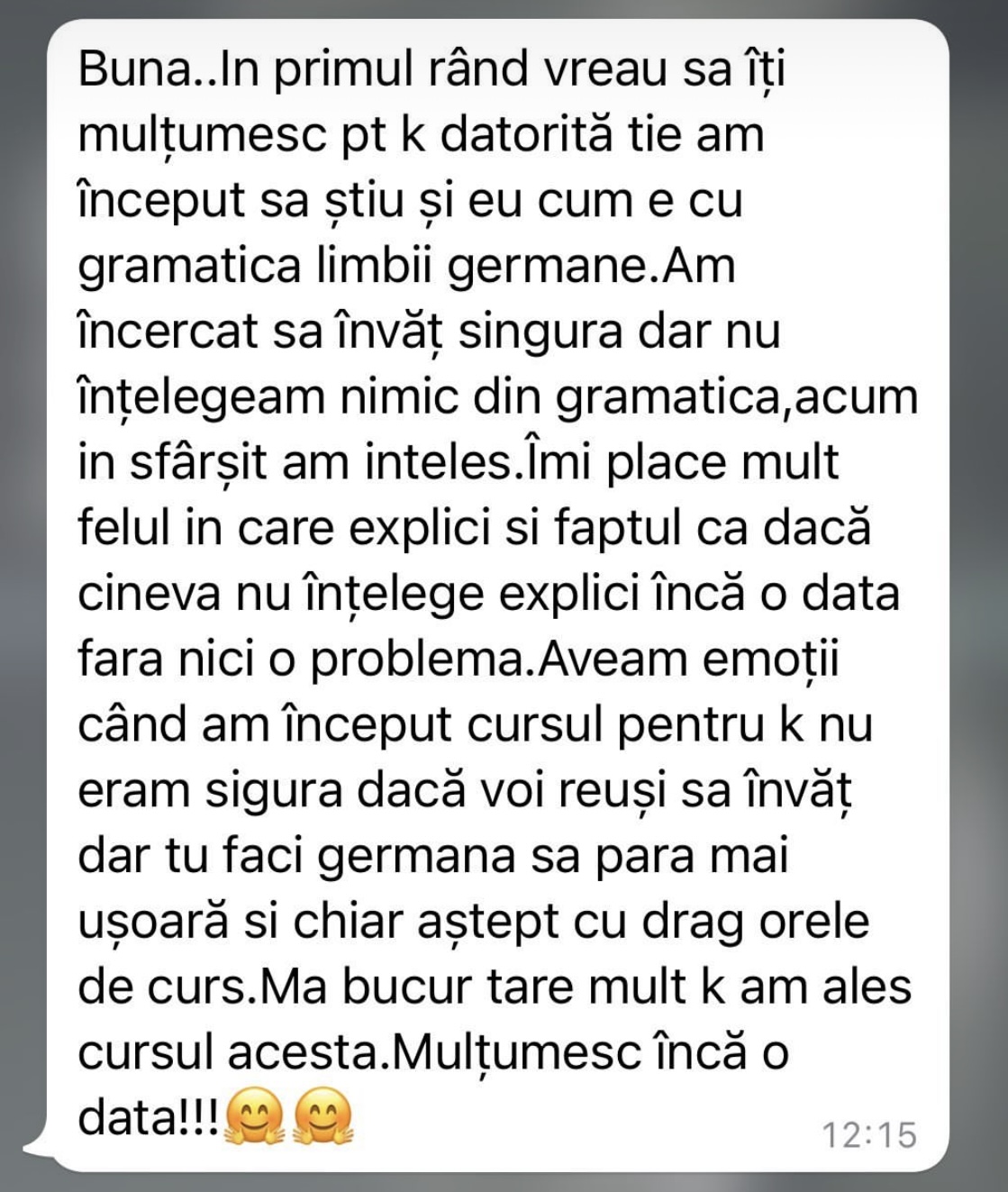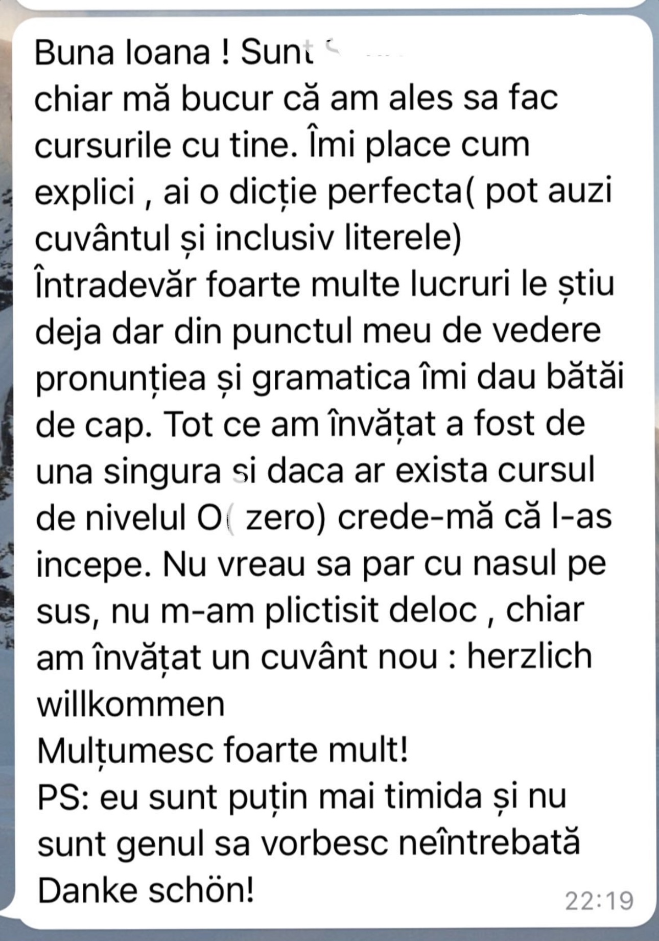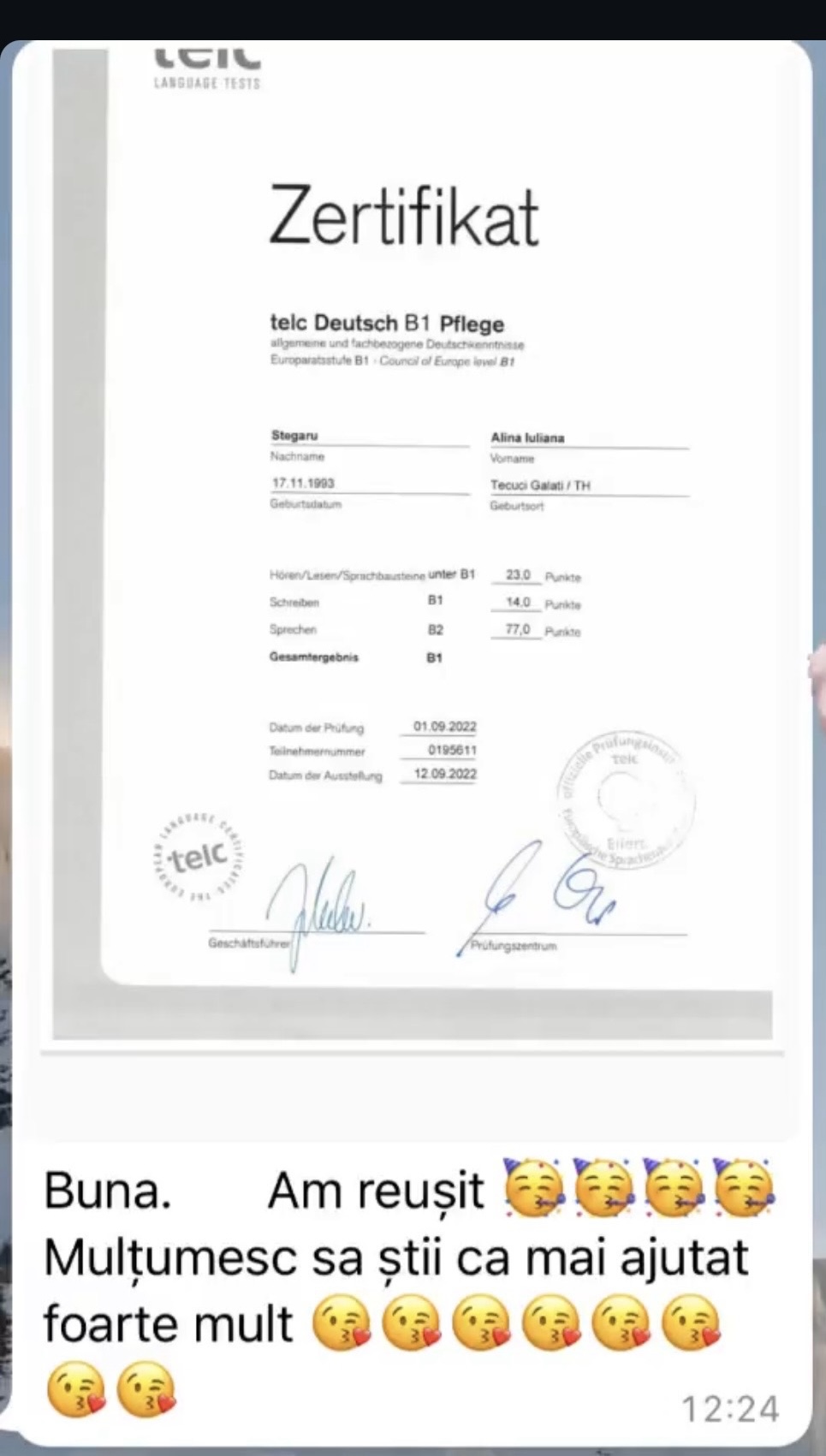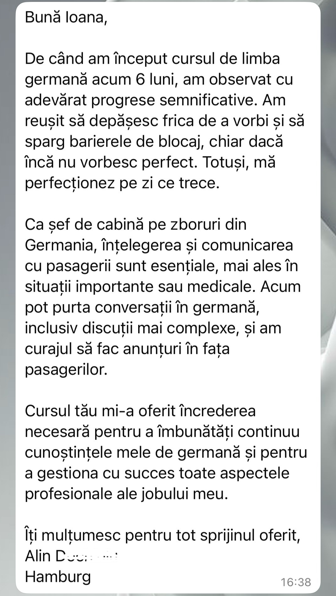 Având în vedere experiența acumulată în cei peste 5 ani de predare a limbii germane în format online, pot spune cu încredere că acei cursanți care și-au păstrat motivația și perseverența de a urma firul roșu trasat de mine au reușit să își atingă obiectivele. În doar 6 luni, au ajuns la nivelul B1 și au obținut certificatul de limbă germană.
