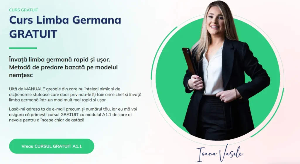 Dacă ești gata să înveți limba germană într-un mod eficient, fără presiune, și vrei să ai rezultate vizibile într-un timp scurt, cursul online oferit de Ioana Vasile este soluția perfectă pentru tine. Programul a fost conceput special pentru începători, fiind structurat într-un mod simplu și accesibil, astfel încât să înveți ușor și rapid, fără a te simți copleșit de manuale complicate sau detalii inutile.